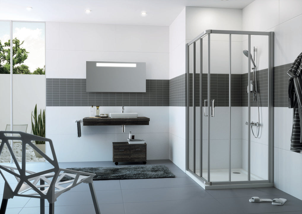 • Částečně orámované dveře s jedním skleněným křídlem. Při montáži s boční stěnou je pro možnost otevírání dveří dovnitř nutný doplňkový set pro otevírání dovnitř a ven