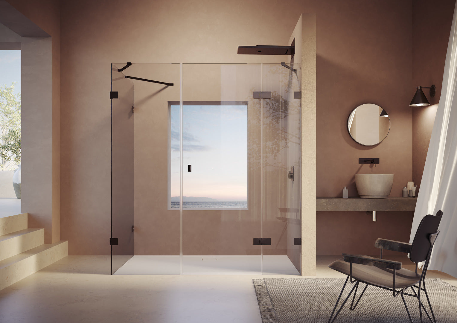 • Keret nélküli ajtó egy üvegajtószárnnyal, befelé és kifelé nyíló, egy fix szegmenssel és oldalelemmel, keret nélküli oldalfallal