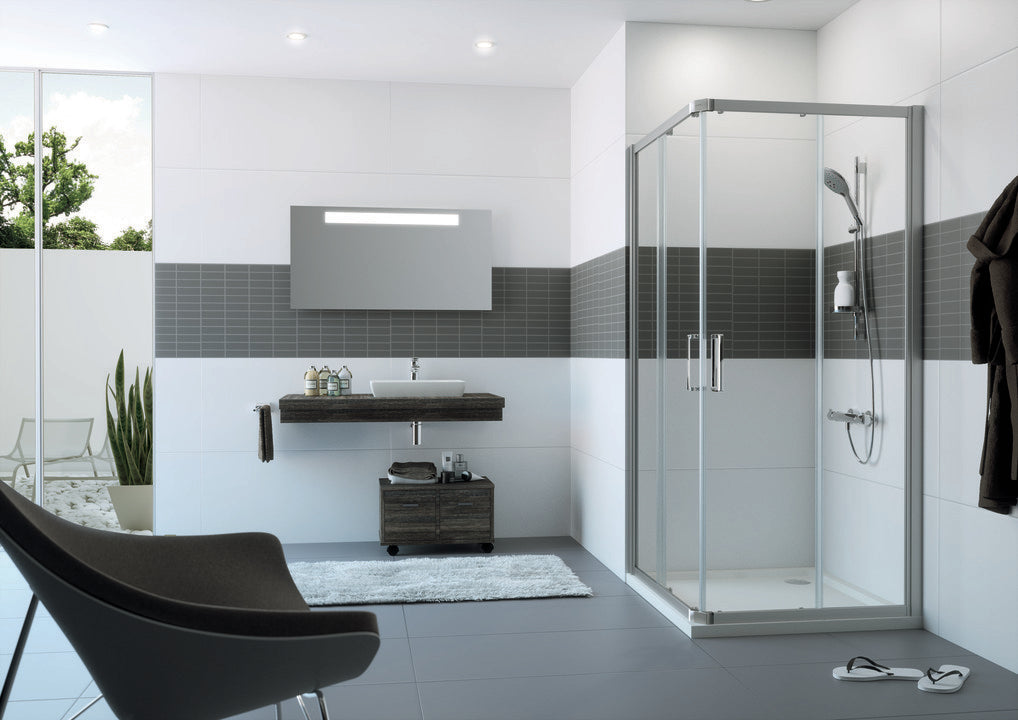 • Zasklení jednovrstvým bezpečnostním sklem tl. 6 mm (dveře) a tl. 4 mm (pevný segment) dle DIN EN 12150, volitelně s povrchovou úpravou HÜPPE Anti-Plaque pro snazší údržbu