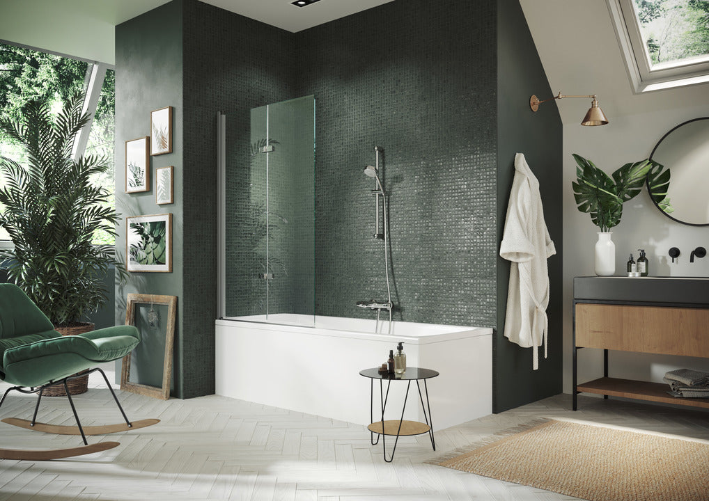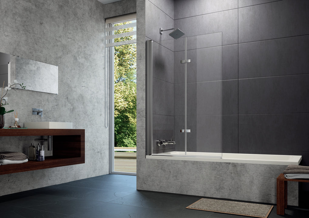 • Částečně orámovaná sklapovací zástěna se dvěma skleněnými křídly, u trubkového pantu otevíravá o 90° dovnitř a ven, v pantu na skle otevíravá o 180° ven