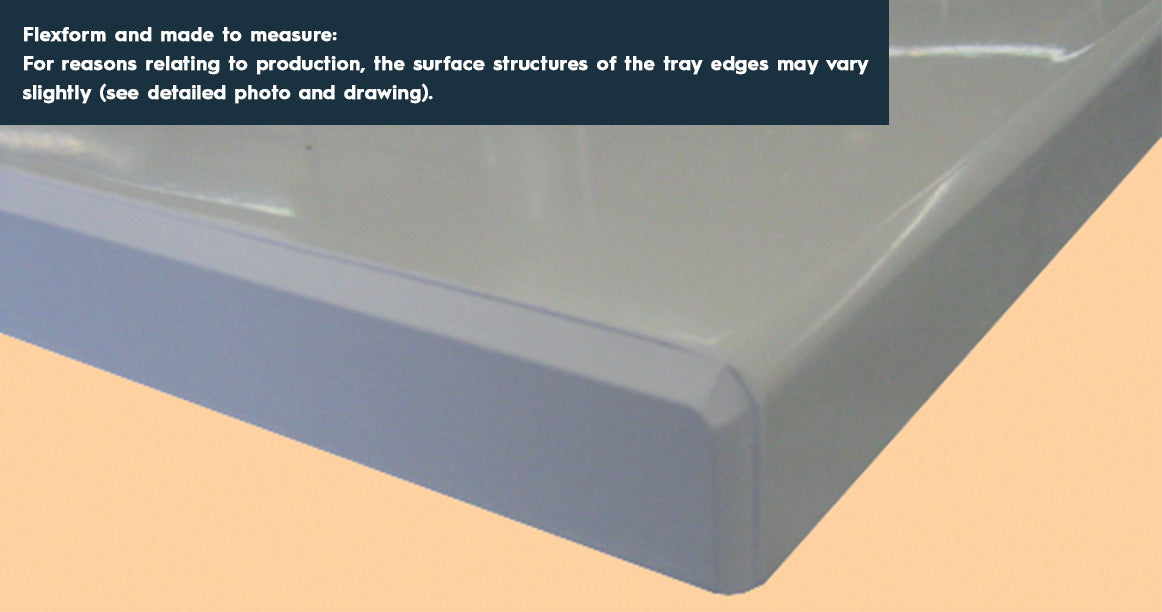 A zuhanytálca méreteire a szokásos tűrésértékek vonatkoznak. A lefolyó átmérője megfelel a lapos tálcákra vonatkozó Euro-szabványnak (Ø 90mm). A műanyag szőnyegek használata a tálca felületén felhólyagosodást okozhat. A zuhanyzó vízelvezető kapacitását illetően a tervezés során figyelmet kell fordítani a zuhanytálca méretének, beépítési helyzetének és a vízelvezető szerelvény és a zuhanyzószerelvény áramlási sebességének megfelelő kombinációjára.